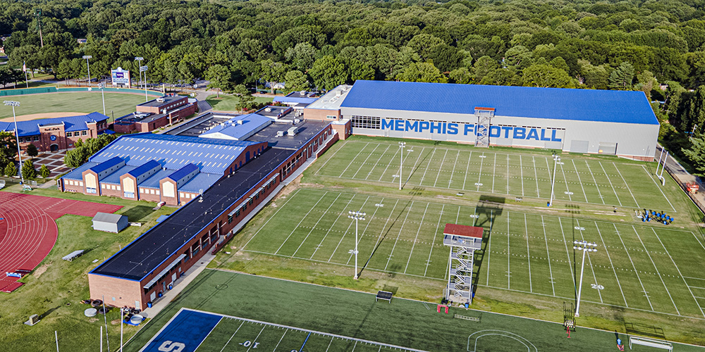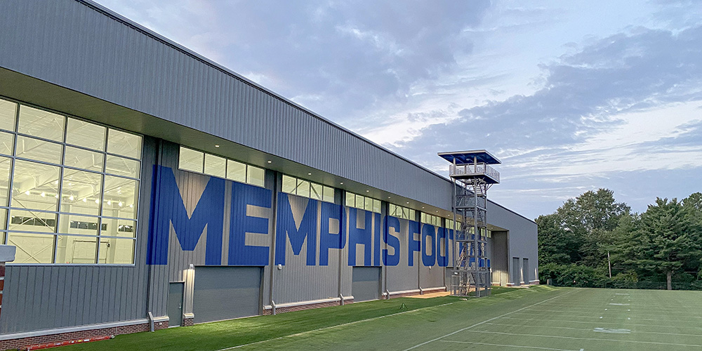 Located at the University of Memphis, in Memphis, TN, this custom pre-engineered metal building was the ideal solution for the new indoor football practice facility. The structure is a 200’ x 400’ clear span building that provides 43’ eave height and 58’ clear ridge height, and connects to an existing brick structure.